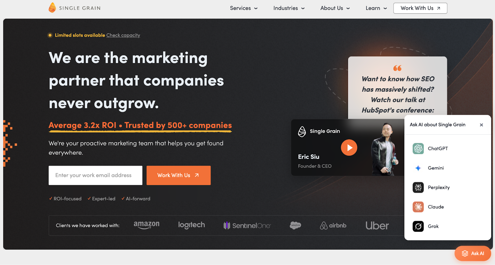 - Overview: Led by well-known marketing expert Eric Siu, Single Grain is a full-service digital agency that offers robust go to market consulting services. Their approach integrates multiple channels, including paid media, SEO, content marketing, and conversion rate optimization, to build a cohesive growth engine.