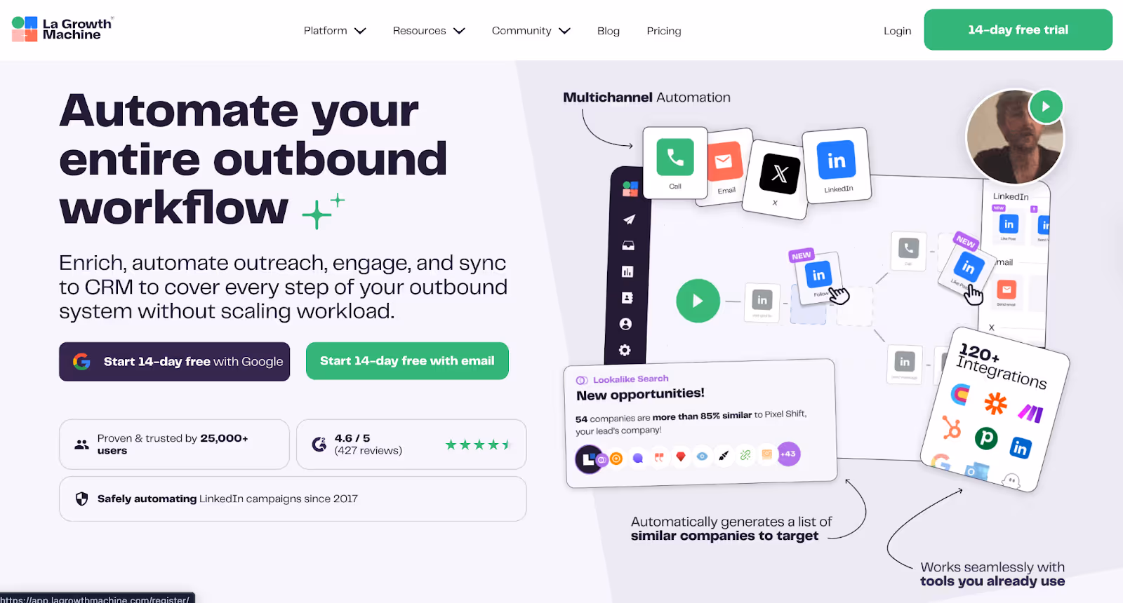 Why It Stands Out: La Growth Machine is an all-in-one multichannel prospecting platform that automates outreach across LinkedIn, email, voice messages, and X (formerly Twitter). Its greatest strength is its deep LinkedIn integration, allowing users to send automated voice messages, perform social warming (auto-likes and follows), and target prospects based on LinkedIn intent data (e.g., people who liked a certain post or attended an event). Its waterfall email enrichment ensures high data accuracy, and the unified inbox centralizes all conversations, making it a powerful tool for teams looking to boost reply rates beyond email-only campaigns.