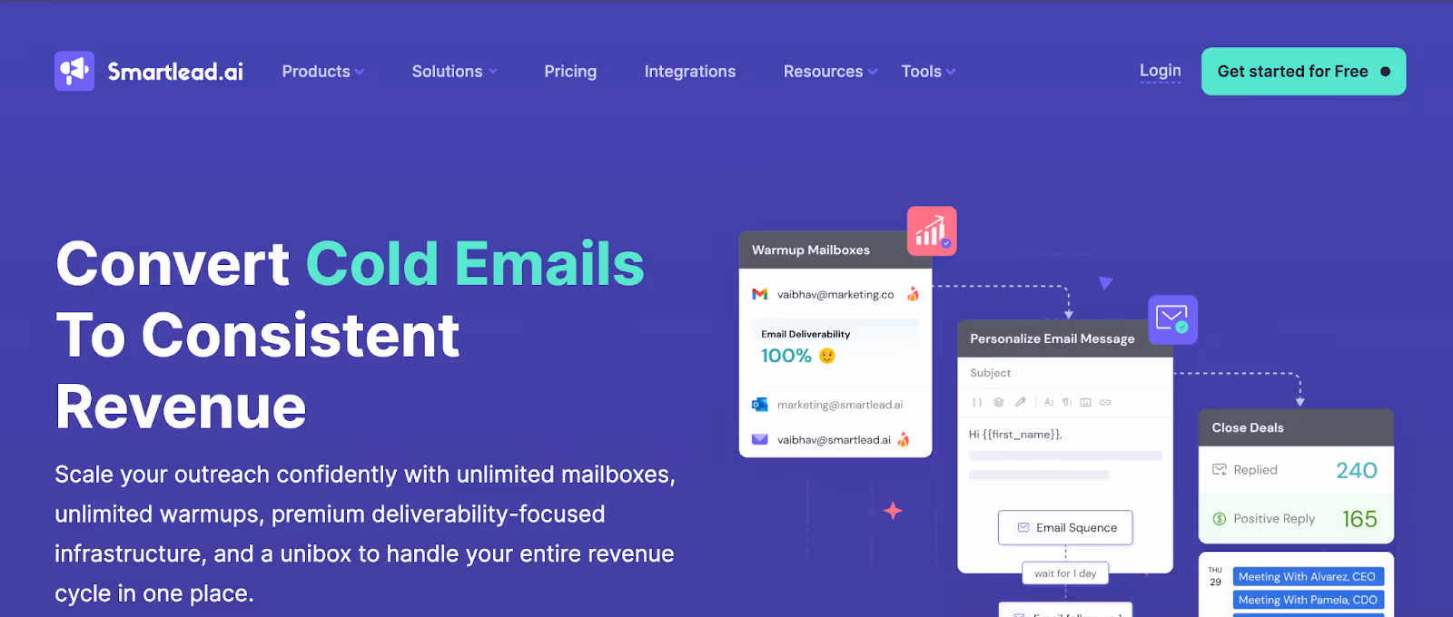 Next on the list is Smartlead. It’s another email deliverability tool you can use to make sure your cold emails land in your prospect’s inbox, not the spam folder. The platform offers multiple mailboxes, which you can use to auto-rotate messages for swift delivery.