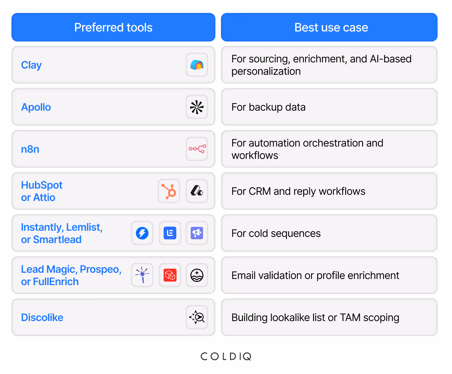With so many tools in the market, it’s essential to choose your stack carefully. ColdIQ has hands-on experience with many of these tools and identifies the right one that serves the best purpose. For context, Kenny Damian, GTM Engineer at ColdIQ, walks us through our preferred and battle-tested tool stack for cold email outreach and their best use case