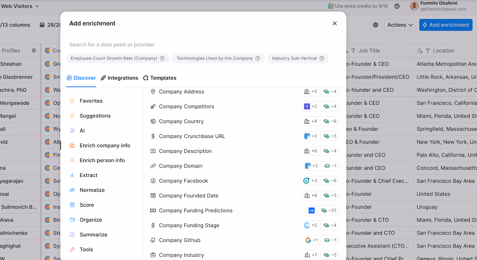 - Then, select “enrich company info.” It will deliver a variety of ways you can enrich targeted companies, such as company address, funding stage, industry, and so on.