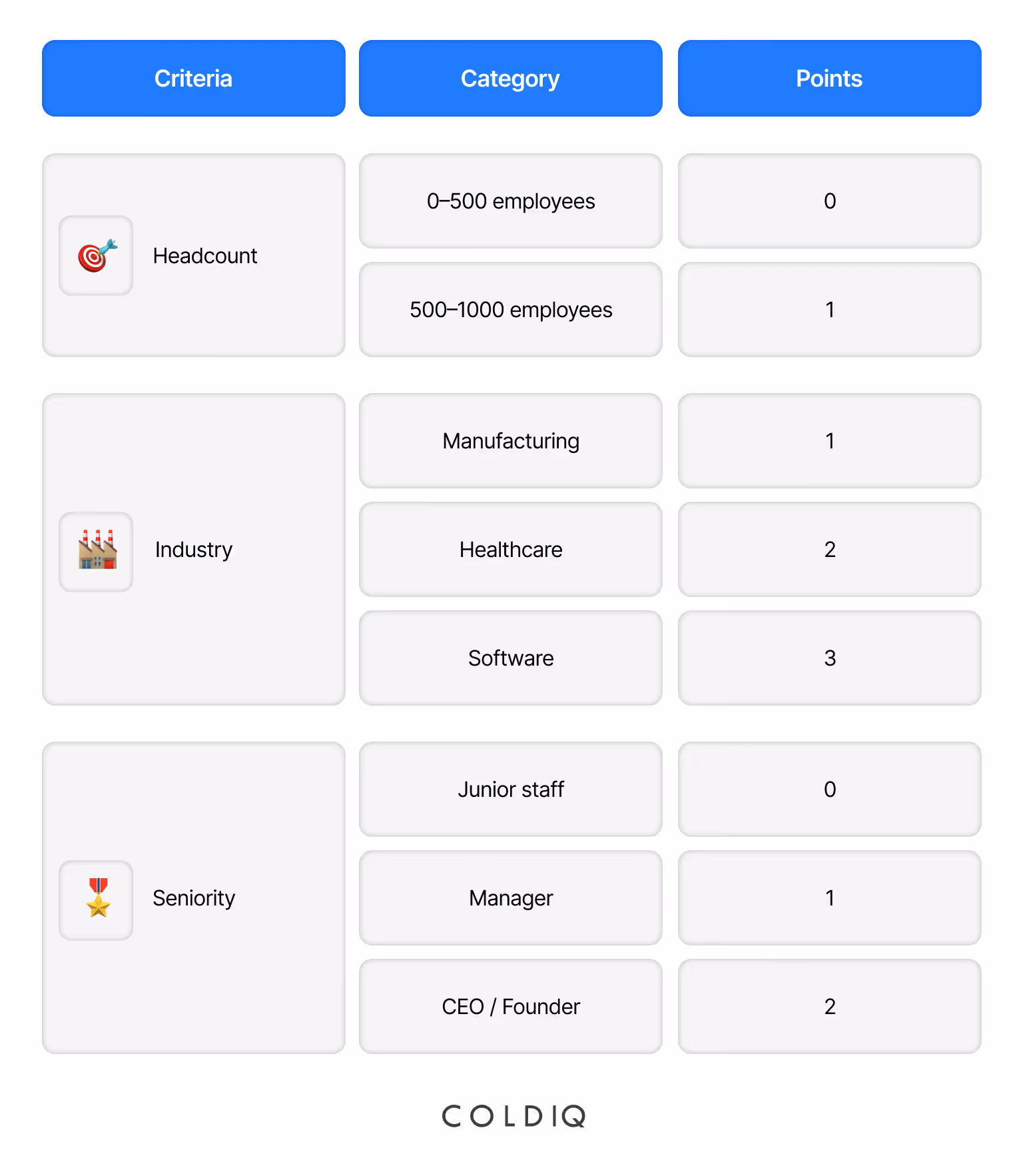 - Fit (Do they match your ICP?): Look at factors like industry, company size, job title, annual revenue, and so on. If they are the kind of customer you want, they should receive a higher score.