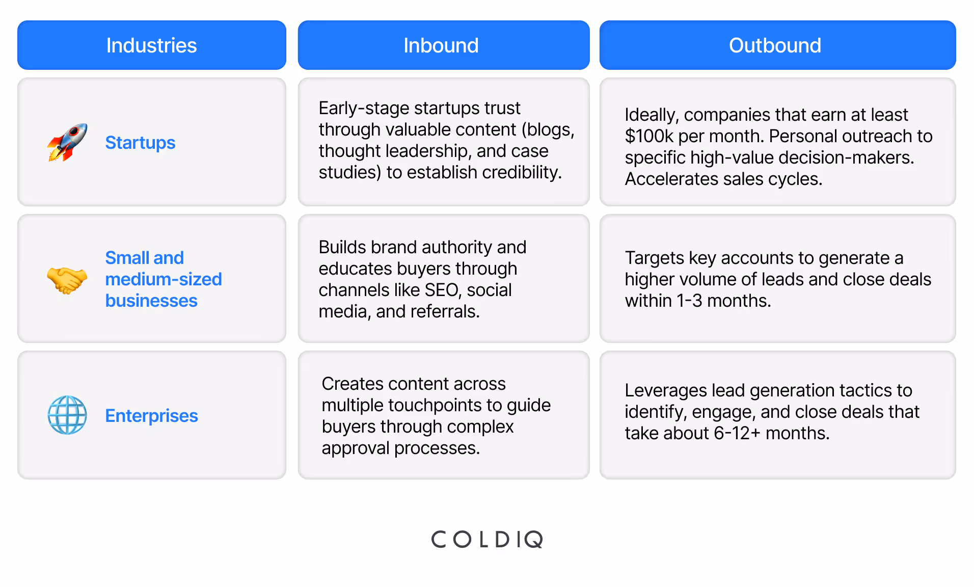 Different companies in various industries benefit from inbound and outbound sales strategies in diverse ways. Before we get into the full details, here is an overview of how companies in different industries leverage inbound and outbound sales strategies to their advantage: