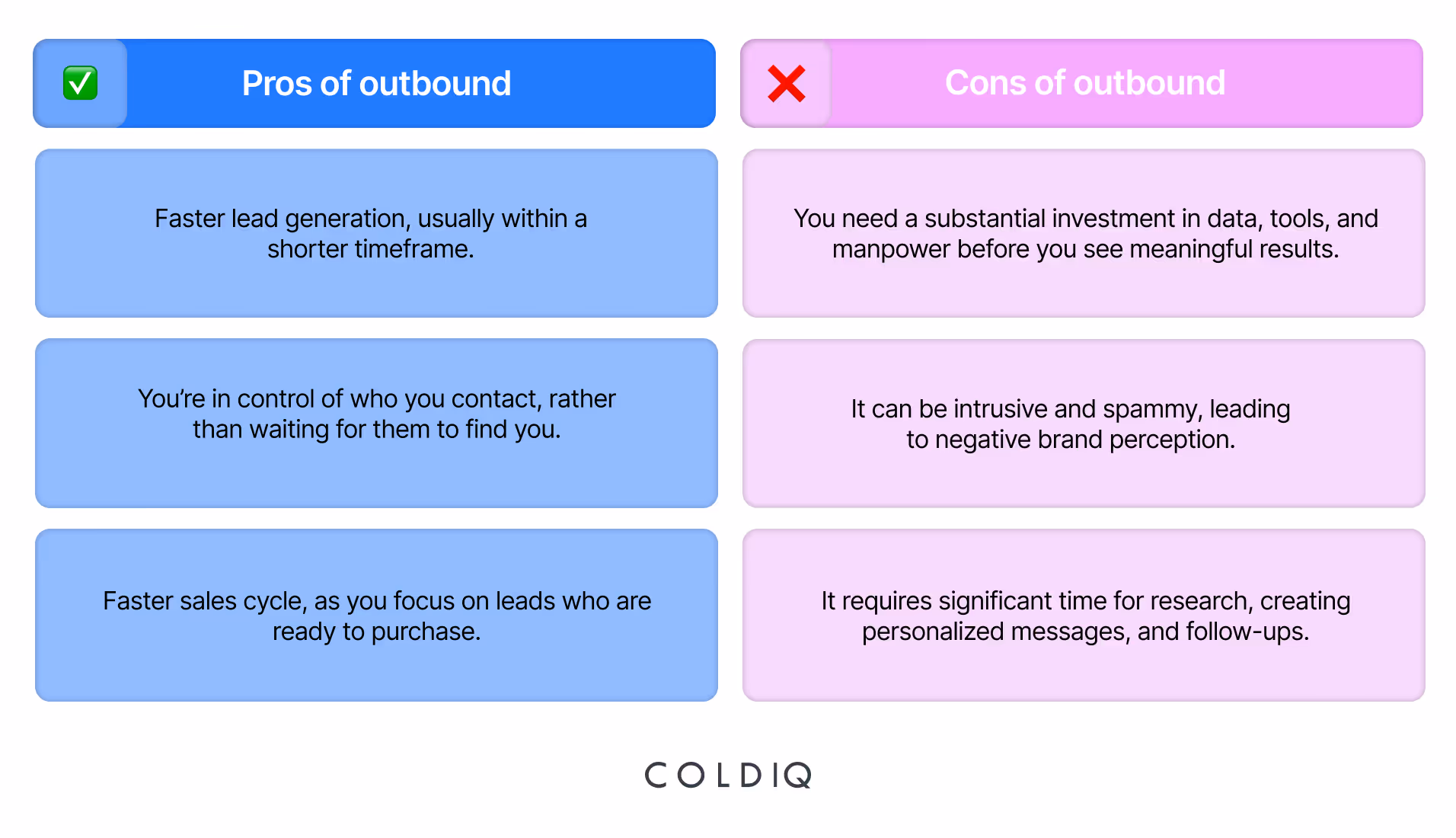 Outbound works well for companies that need immediate conversations or want to test new markets, since the results depend more on the volume and targeting of outreach than on waiting for prospects to discover you.