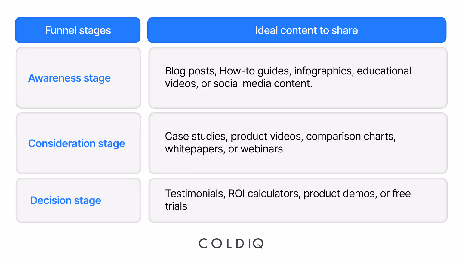 Your job is to simplify touchpoints across each stage with relevant content. This approach will not only build trust and drive more engagement but also shorten the sales cycle. With that, you forge a stronger relationship and ultimately, drive conversions. Below is a quick overview of the relevant content you can provide for each stage of the buyer’s journey.