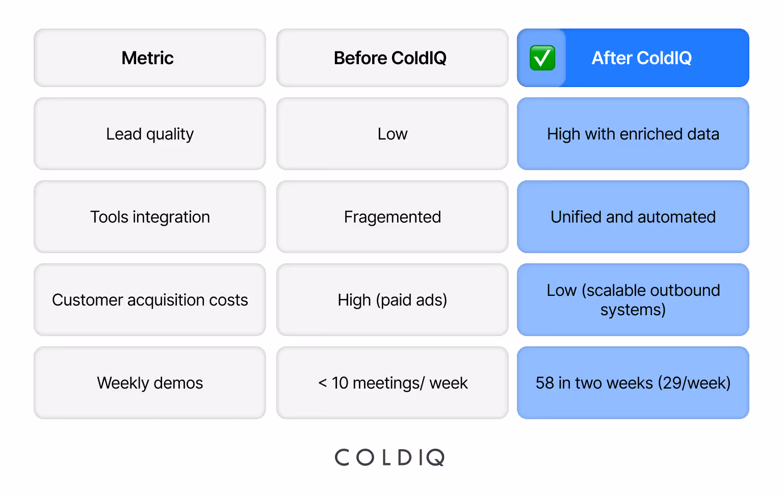 Upon partnering with ColdIQ, their sales process changed. They gained tactical advice and used AI and automation tools to speed up efforts. Within two weeks, 58 leads flooded their sales pipeline, accelerating their revenue growth.