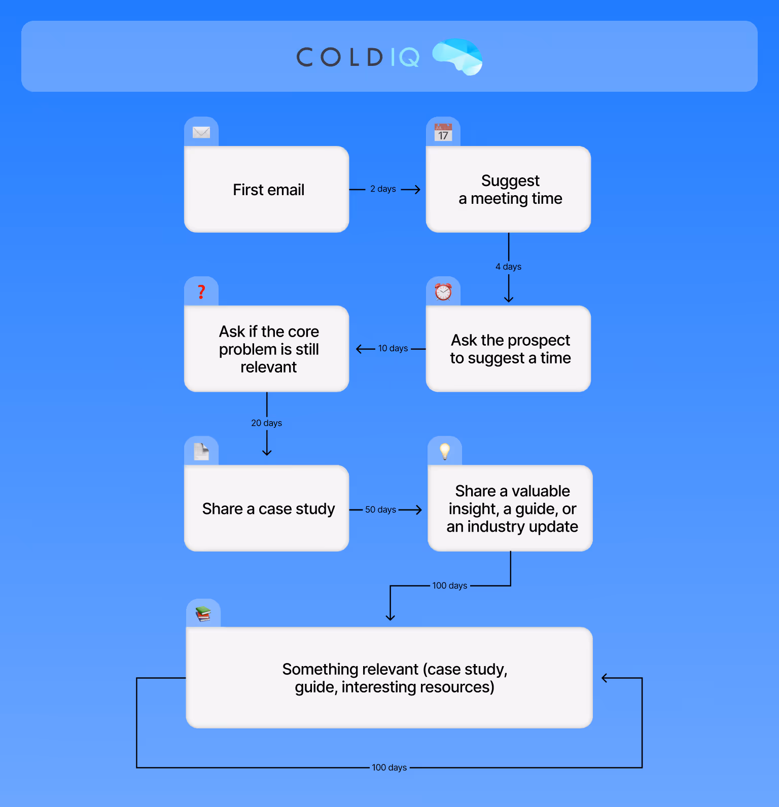 - Day 100 - And then continuing every 100 days after that, try to follow up with something relevant (case study, guide, interesting resources
