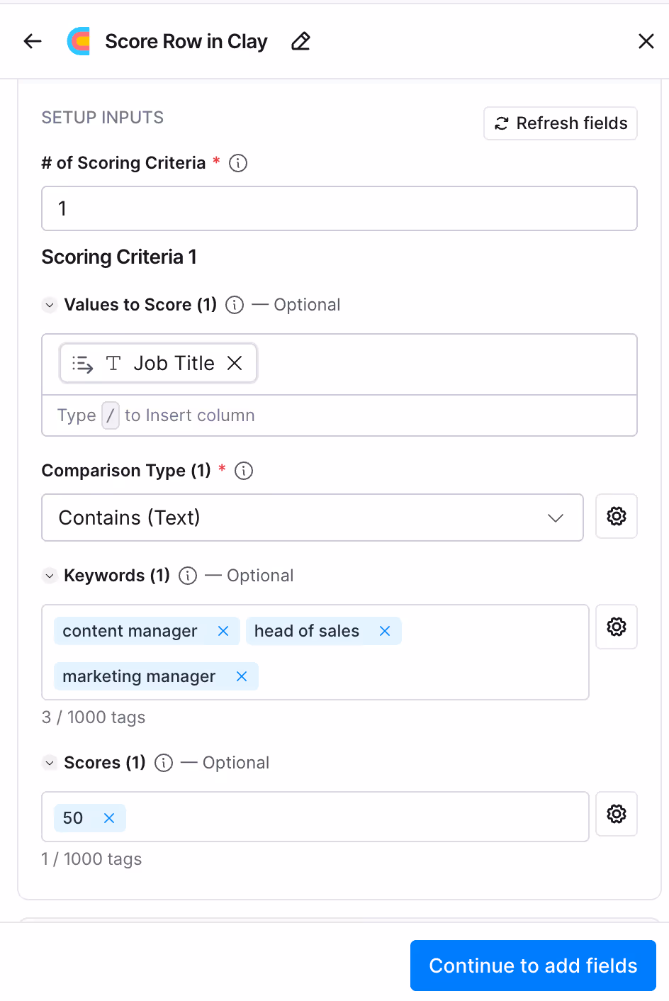 - Select the Value you want to score. This comes from the column in your Clay table. It could be job title, industry, headcount, and so on. For this example, we used “Job title”