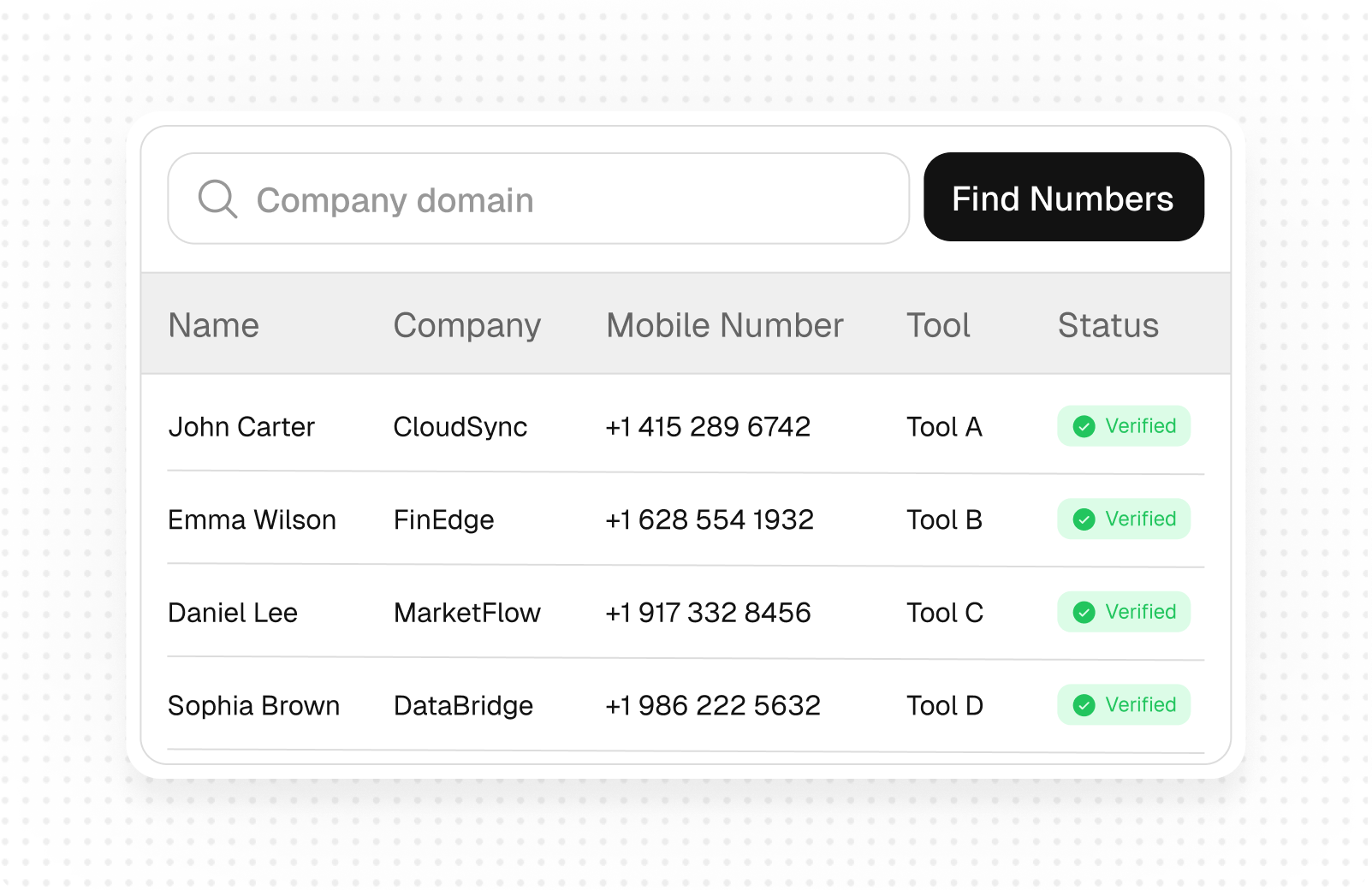 Find verified phone numbers in bulk. Upload a list and get results fast.